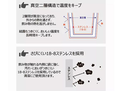 - 真空2層構造なので保温・保冷効果が高く、おいしい温度を長時間キープ