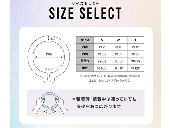 | その他備考 | 【S】内径約9cm、内周約30cm、 首回り22-32cm、重さ約100g 【M】内径約10cm、内周約34cm、 首回り30-37cm、重さ約110g 【L】内径約12cm、内周約38cm、 首回り30-39cm、重さ約120g |